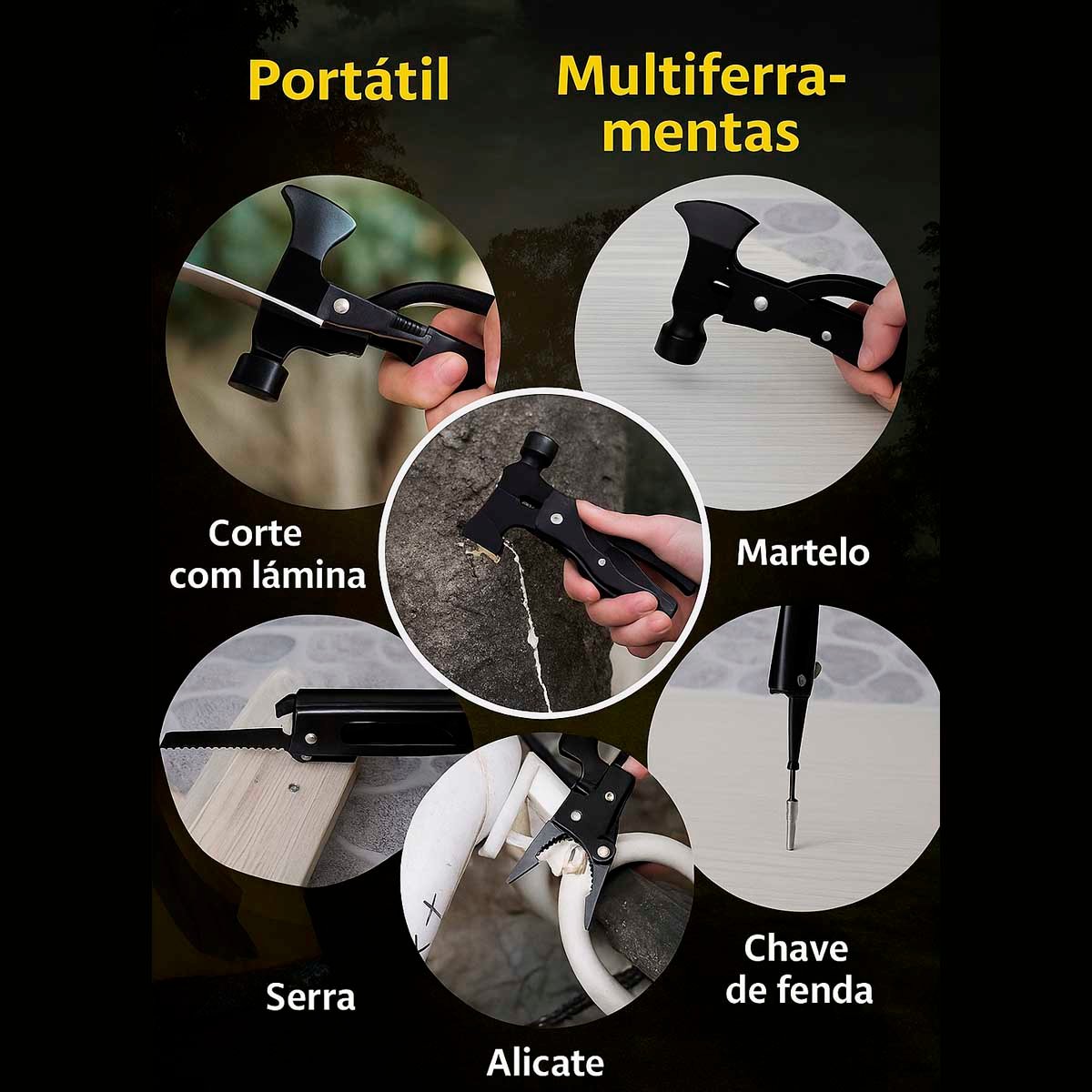 eficiência. Ao acampar, pescar, caçar, caminhar ou fazer mochila, sempre há um martelo multifuncional. Muito adequado para o seu carro, escritório ou