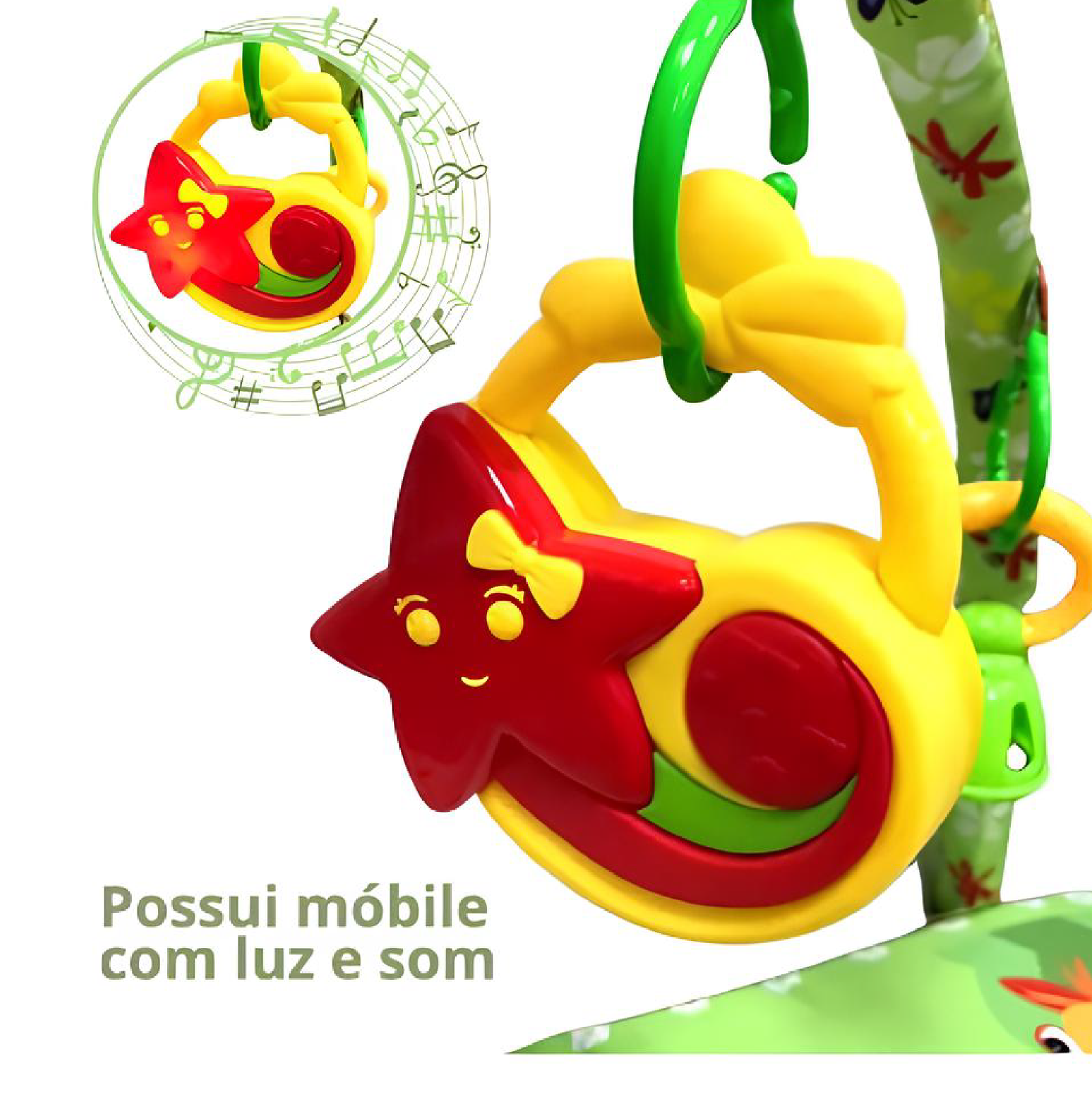 Acompanha móbile com 5 brinquedos interativos